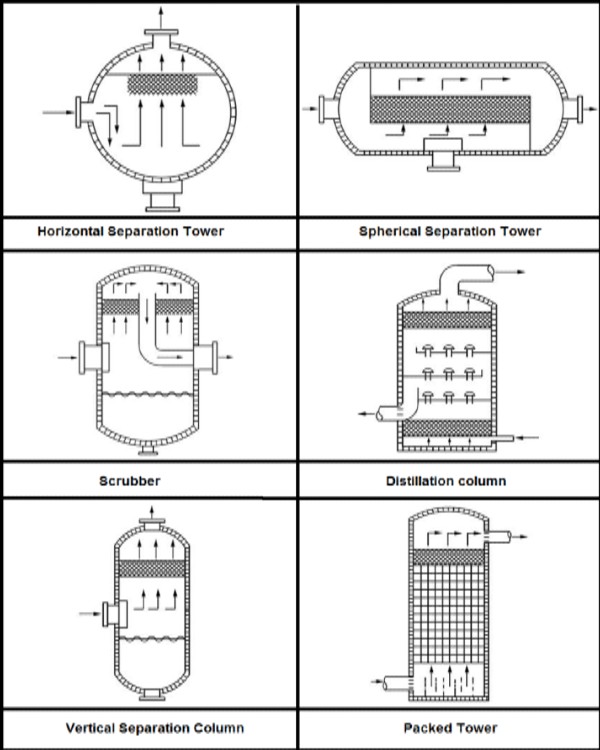 Demister can be installed in columns or vessels or towers in various positions depending upon the shape, vapor inlet nozzle location, vapor outlet nozzle location, liquid outlet nozzle location, and process applications. Below is the figure showing such a few installation types.
